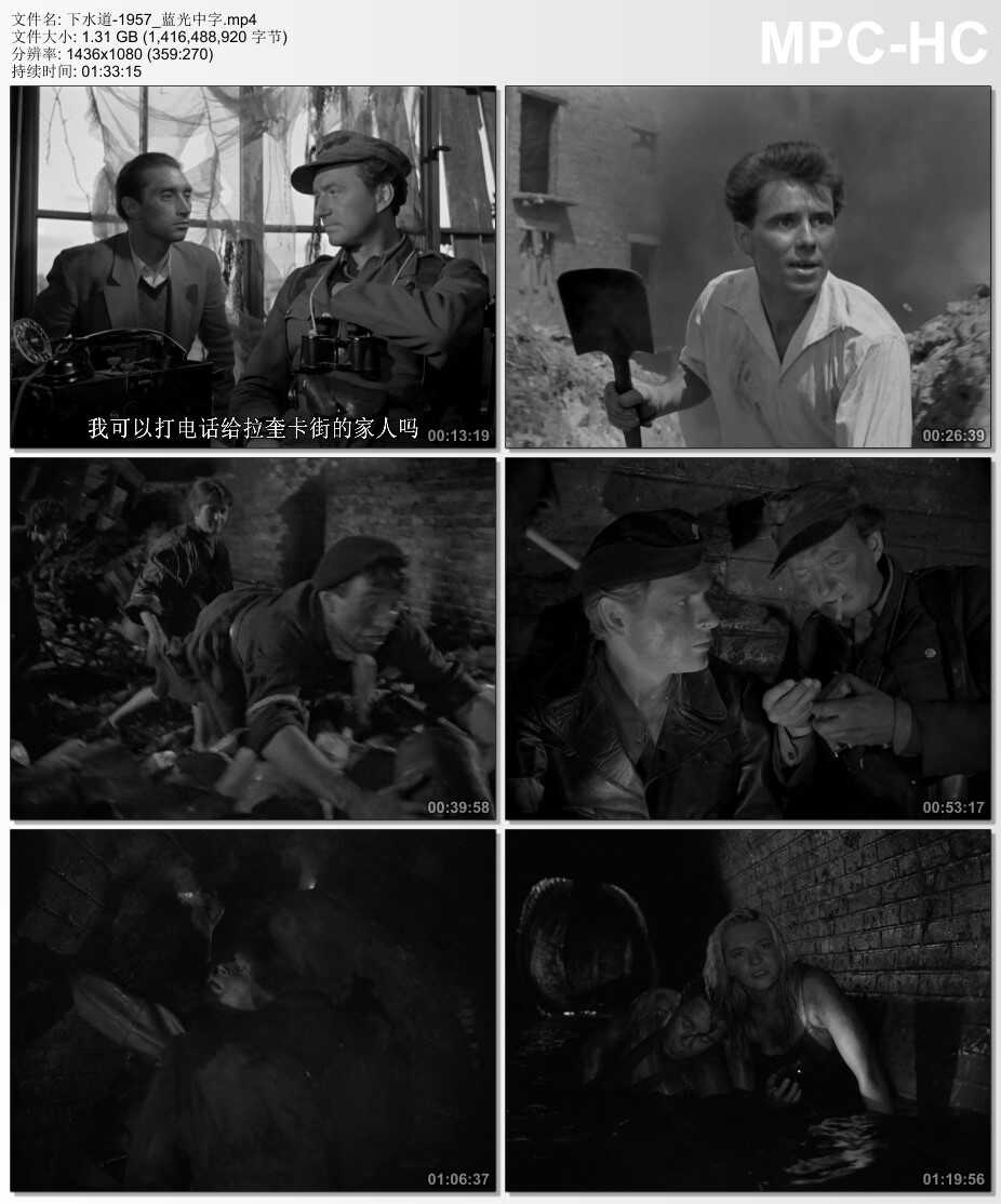 1944年9月底,悲剧性的华沙起义已接近尾声,一支波兰“国家军”在中尉查德拉(WienczyslawGlinski饰)带领下驻防一栋破败的建筑。华沙市内被德军分块切断,与家人失散的作曲家米考只好在这支30人小队中栖身。悬殊的军事差距让战士们心灰意懒,米考的钢琴声有些怪异的飘荡在废墟上空。德军的小型攻势很快让队伍无法招架,全员进入下水道转移阵地。波兰战士们在没有饮食的下水道中茫然前行,德军不时投放毒气,有一些战士疯掉了,但更多人死在了下水道中。查德拉的队伍很快迷失了方向,战士们也分别迷失在暗无天日的下水道中……本片获1957年戛纳电影节评委会大奖。是导演安杰依·瓦伊达(AndrzejWajda)战争三部曲的第二部。◎获奖情况第10届戛纳电影节(1957)主竞赛单元金棕榈奖(提名)安杰伊·瓦伊达主竞赛单元评审团特别奖安杰伊·瓦伊达